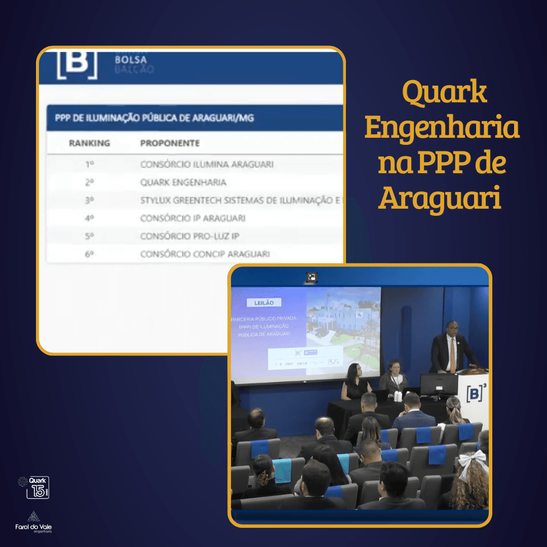A Quark Engenharia participou no dia 07 de Junho, do leilão de Parceria Público-Privada (PPP) para a concessão dos serviços de iluminação pública do município de Araguari, realizado na B3. O leilão faz parte de uma iniciativa para modernizar a infraestrutura de iluminação pública da cidade, que envolve a atualização tecnológica e a instalação de lâmpadas LED para promover eficiência energética e segurança​​.